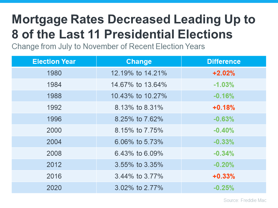 Home prices are pretty resilient. They generally rise year-over-year, regardless of elections. The latest data from NAR shows after seven of the last eight Presidential elections, home prices increased the following year (see graph below):