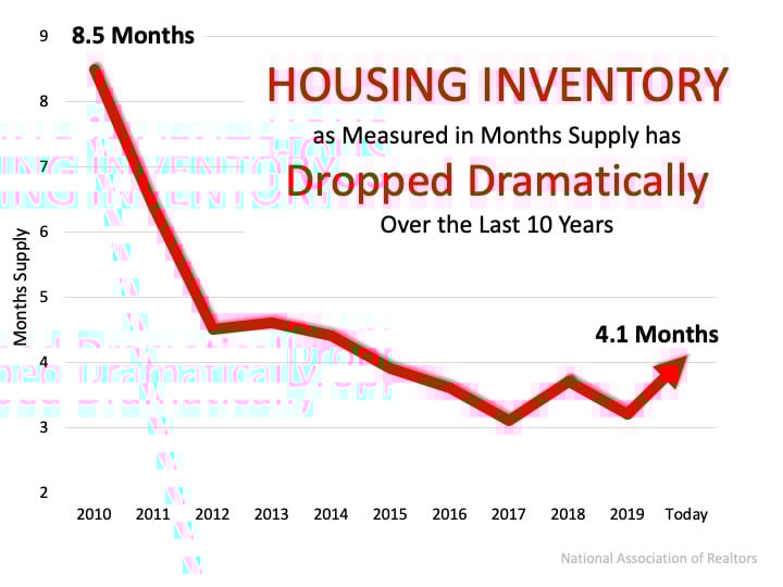 Making our way through the month of June and entering the second half of the year, we face an undersupply of homes on the market. Keep in mind, this undersupply is going to vary by location and by price point. According to the National Association of Realtors (NAR), across the country, we currently have a 4.1 months supply of homes on the market. Historically, 6 months of supply is considered a balanced market. Anything over 6 months is a buyer’s market, meaning prices will depreciate. Anything below 6 months is a seller’s market, where prices appreciate. The graph below shows inventory across the country since 2010 in months supply of homes for sale.