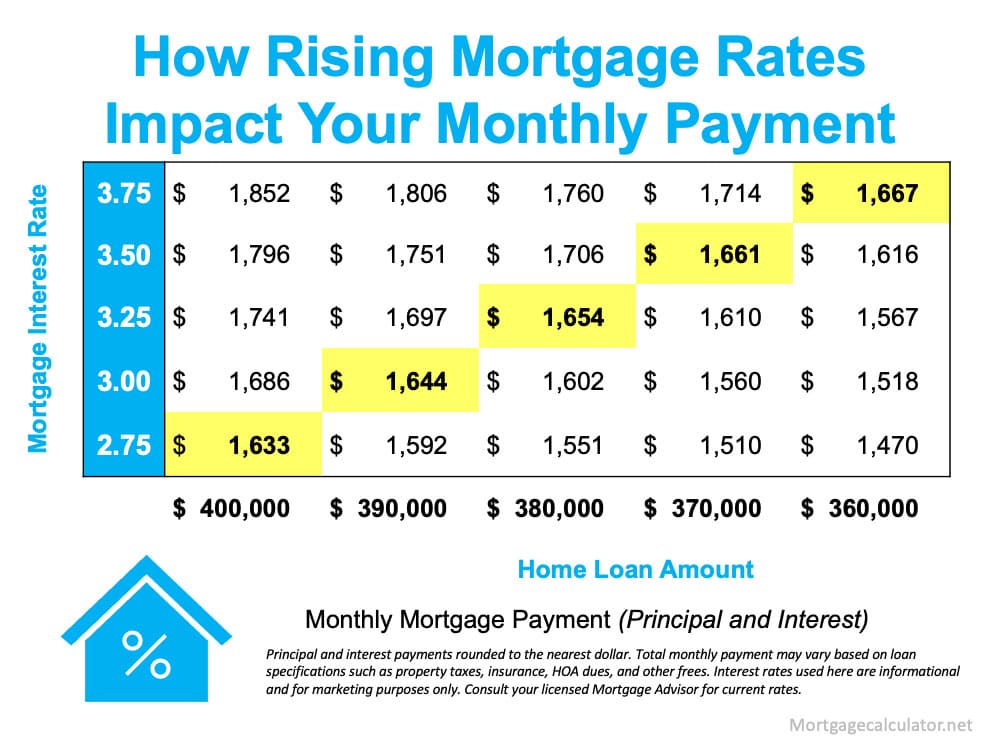 Mortgage rates play a significant role in your home search. As rates go up, your monthly mortgage payment increases if you're buying a home, directly affecting how much you can afford. And even the smallest increase can have a large impact on your monthly payment (see chart below):