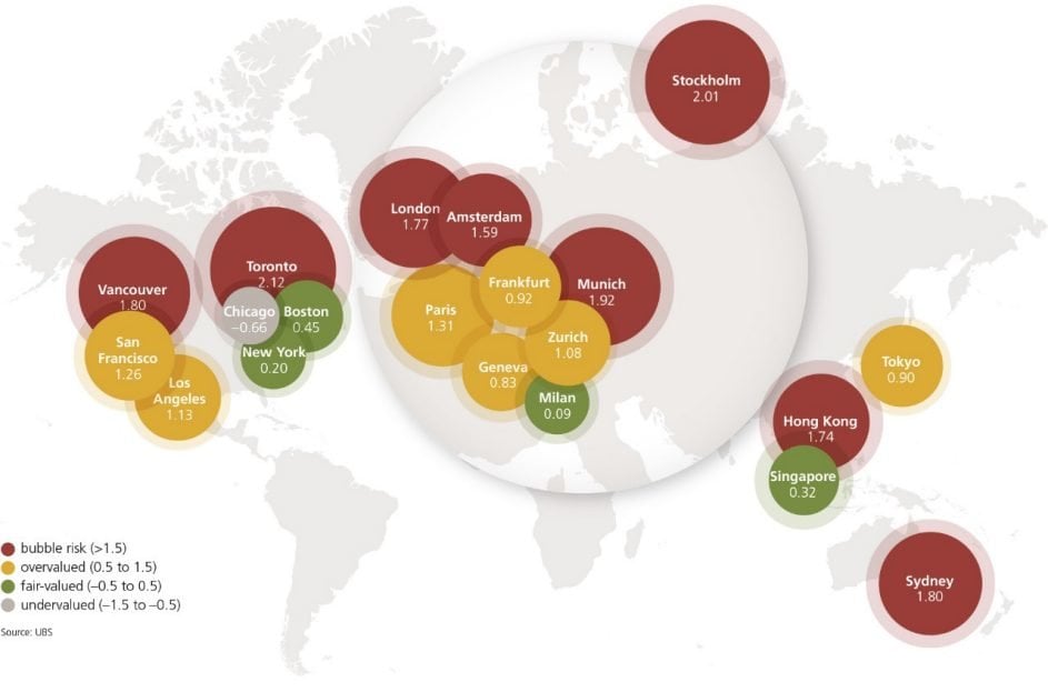 The link below is to an article summarizing the findings of the UBS Global Real Estate Bubble Index. It showcases major cities throughout the world, including Boston, and sorts them into four categories: bubble risk, overvalued, fair-valued, and undervalued.